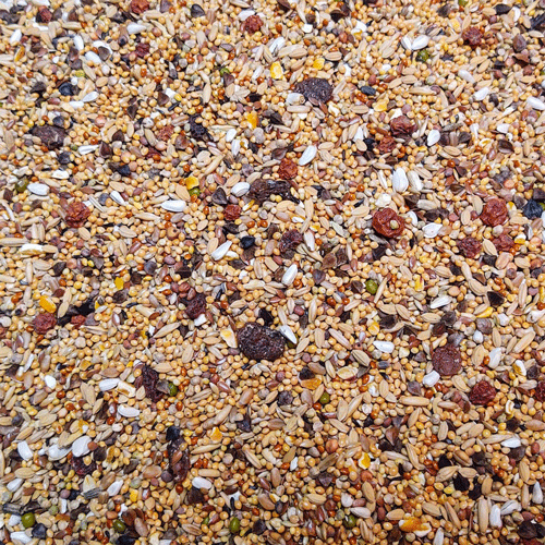 Alleinfuttermittel für Vögel. Zutaten: Buchweizen, Milocorn, Dari-Weizen, geschälter Hafer, Spitzhafer, Weißkorn, Saflor, Katjang Idjoe, Leinsamen, Maisbruch, gelbe Hirse, rote Hirse, Nigersamen, Rohreis, Spinatsamen, Vogelbeeren, Radieschensamen, Rosinen, Weizen. Immer ausreichend frisches Trinkwasser bereitstellen. Kühl und dunkel lagern.