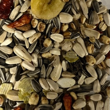 Zutaten: Gestreifte Sonnenblumenkerne, Weiße Sonnenblumenkerne, Mais, Erdnüsse ohne Schale, Hafer, Pinienkerne, Popcornmais, gepuffter Weizen, Buchweizen, Erbsenflocken, Papaya, Rosinen, getrocknete Bananenstücke, Kürbiskerne, rote Paprika. Immer ausreichend frisches Trinkwasser bereitstellen. Kühl und dunkel lagern.